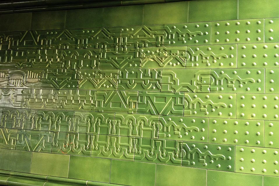 Artist Tod Hanson was appointed to create artwork for this London borough railway bridge. The design team and Tod decided to use green faience tiles, which are used on the Northern Line and across London, to link the sites.